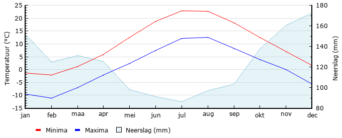 | Gem. min. temperatuur in °C | -9.6 | -11.1 | -7.0 | -2.2 | 2.3 | 7.4 | 12.1 | 12.5 | 8.2 | 4.0 | 0.0 | -5.7 |