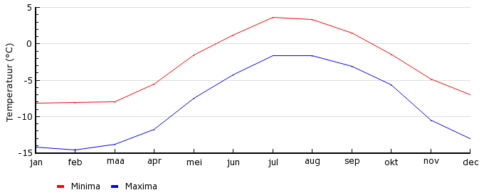 | Gem. min. temperatuur in °C | -14.2 | -14.6 | -13.8 | -11.8 | -7.5 | -4.3 | -1.6 | -1.6 | -3.1 | -5.6 | -10.5 | -13.0 |