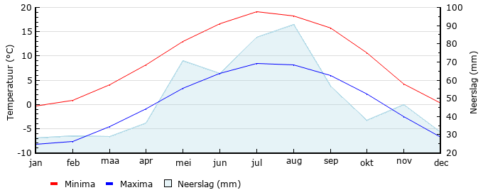 Gem. max. temperatuur in °C | -0.3 | 0.9 | 4.1 | 8.2 | 13.0 | 16.6 | 19.1 | 18.2 | 15.8 | 10.7 | 4.2 | 0.3 |