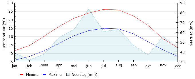 | Gem. min. temperatuur in °C | -4.0 | -1.7 | 1.6 | 6.0 | 10.5 | 13.6 | 15.0 | 14.7 | 11.7 | 7.0 | 2.2 | -1.7 |