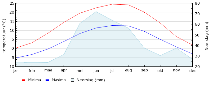 | Gem. min. temperatuur in °C | -5.2 | -3.3 | -0.2 | 3.9 | 8.3 | 11.3 | 12.7 | 12.6 | 9.5 | 5.0 | 0.9 | -3.0 |