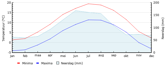 | Gem. min. temperatuur in °C | -4.1 | -3.6 | -1.2 | 1.8 | 6.0 | 9.0 | 11.3 | 11.2 | 8.9 | 5.2 | .0 | -3.2 |