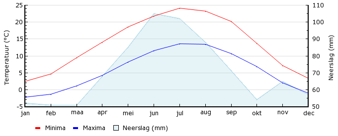 | Gem. max. temperatuur in °C | 2.4 | 4.6 | 9.5 | 14.0 | 18.6 | 21.8 | 24.1 | 23.3 | 20.1 | 13.8 | 7.2 | 3.3 |