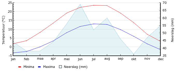 | Gem. min. temperatuur in °C | -3.4 | -2.7 | .0 | 3.4 | 8.0 | 11.5 | 13.0 | 12.7 | 9.8 | 6.0 | 1.7 | -1.7 |