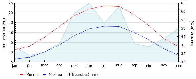 | Gem. min. temperatuur in °C | -3.6 | -2.7 | .1 | 3.6 | 8.3 | 11.8 | 13.2 | 13.0 | 10.0 | 6.2 | 1.8 | -1.8 |