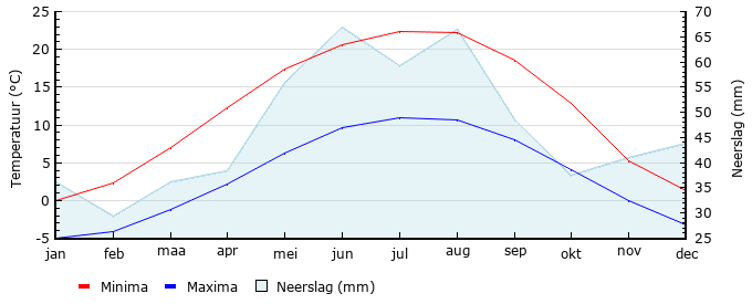 | Gem. max. temperatuur in °C | 0.0 | 2.3 | 7.0 | 12.2 | 17.4 | 20.6 | 22.4 | 22.2 | 18.5 | 12.8 | 5.2 | 1.3 |