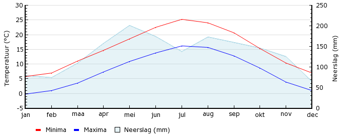 | Gem. max. temperatuur in °C | 5.8 | 7.0 | 11.1 | 14.7 | 18.5 | 22.5 | 25.2 | 24.1 | 20.6 | 15.4 | 10.4 | 6.9 |
