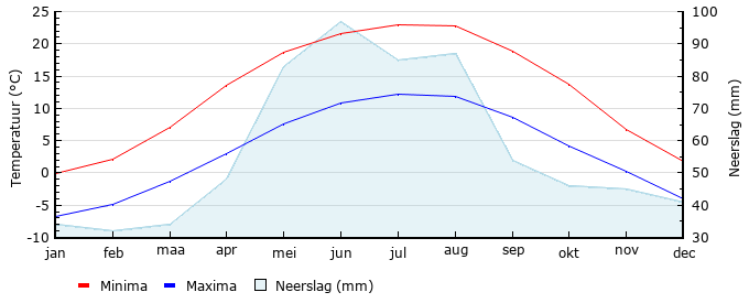 | Gem. min. temperatuur in °C | -6.7 | -4.8 | -1.3 | 3.0 | 7.6 | 10.8 | 12.2 | 11.8 | 8.6 | 4.2 | .2 | -4.0 |