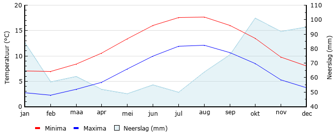| Gem. min. temperatuur in °C | 2.7 | 2.2 | 3.4 | 4.8 | 7.4 | 10.0 | 11.9 | 12.1 | 10.6 | 8.5 | 5.3 | 3.7 |
