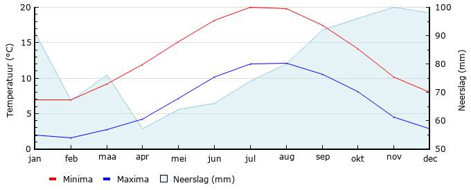 | Gem. min. temperatuur in °C | 2.0 | 1.6 | 2.7 | 4.2 | 7.1 | 10.1 | 12.0 | 12.1 | 10.5 | 8.1 | 4.5 | 2.8 |