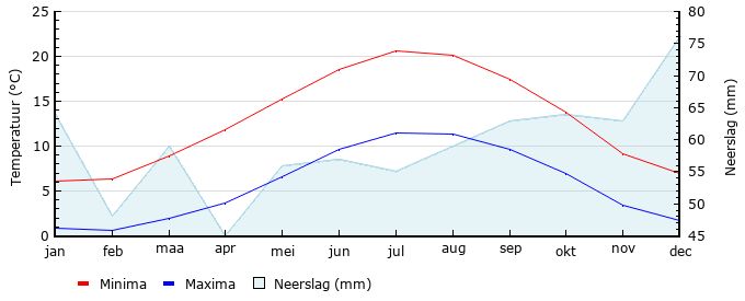 | Gem. max. temperatuur in °C | 6.1 | 6.4 | 8.9 | 11.8 | 15.3 | 18.5 | 20.6 | 20.1 | 17.5 | 13.8 | 9.2 | 7.0 |