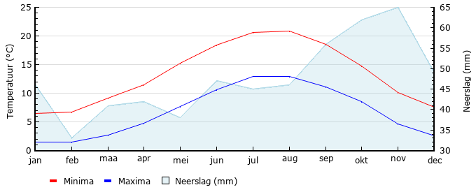 | Gem. max. temperatuur in °C | 6.5 | 6.7 | 9.2 | 11.5 | 15.3 | 18.4 | 20.6 | 20.8 | 18.5 | 14.8 | 10.1 | 7.6 |
