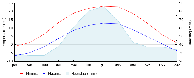 | Gem. max. temperatuur in °C | -1.1 | 1.1 | 6.3 | 13.2 | 18.8 | 21.8 | 23.2 | 22.8 | 18.6 | 12.9 | 5.9 | 1.0 |
