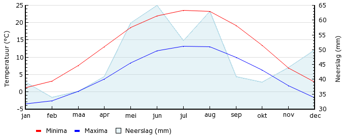 | Gem. min. temperatuur in °C | -3.6 | -2.7 | .1 | 3.6 | 8.3 | 11.8 | 13.2 | 13.0 | 10.0 | 6.2 | 1.8 | -1.8 |
