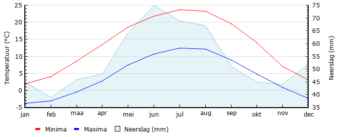 | Gem. min. temperatuur in °C | -3.8 | -3.1 | -.4 | 2.8 | 7.4 | 10.7 | 12.4 | 12.1 | 8.9 | 4.8 | .8 | -2.3 |