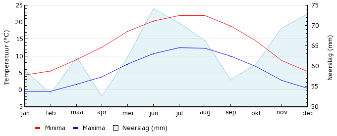 | Gem. max. temperatuur in °C | 4.4 | 5.5 | 8.9 | 12.6 | 17.3 | 20.3 | 21.9 | 21.9 | 18.8 | 14.5 | 8.6 | 5.4 |