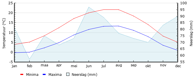 | Gem. max. temperatuur in °C | 3.9 | 5.1 | 8.3 | 12.4 | 17.1 | 20.0 | 21.6 | 21.6 | 18.4 | 14.0 | 8.1 | 4.9 |
