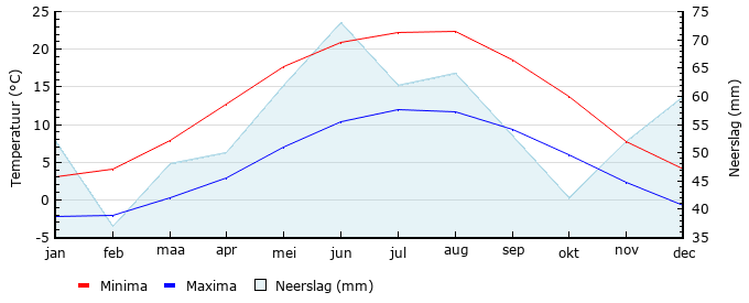 | Gem. min. temperatuur in °C | -2.2 | -2.0 | .3 | 2.9 | 7.0 | 10.3 | 12.0 | 11.7 | 9.4 | 6.0 | 2.3 | -.7 |