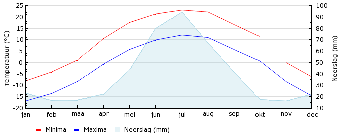 | Gem. min. temperatuur in °C | -17.0 | -13.7 | -8.4 | -0.7 | 5.7 | 9.9 | 12.0 | 11.0 | 5.6 | 0.6 | -8.4 | -14.8 |