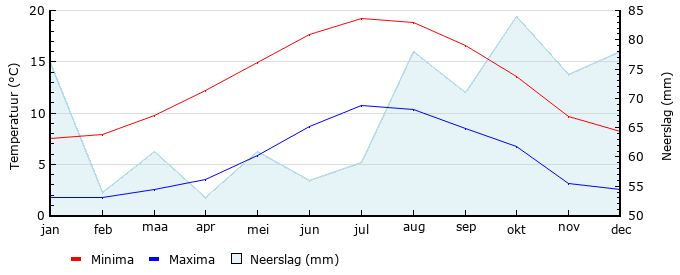 | Gem. max. temperatuur in °C | 7.5 | 7.9 | 9.8 | 12.2 | 14.9 | 17.7 | 19.2 | 18.8 | 16.6 | 13.6 | 9.7 | 8.2 |