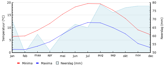 | Gem. max. temperatuur in °C | 6.4 | 6.6 | 8.9 | 11.6 | 15.3 | 18.2 | 19.6 | 19.5 | 17.0 | 13.7 | 9.1 | 7.1 |