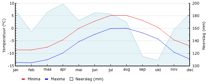 | Gem. min. temperatuur in °C | -13.6 | -13.8 | -12.6 | -9.9 | -5.4 | -2.4 | -.1 | .0 | -1.8 | -4.3 | -9.5 | -12.3 |