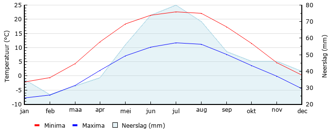 | Gem. min. temperatuur in °C | -7.7 | -6.8 | -3.4 | 1.9 | 7.0 | 10.2 | 11.7 | 11.1 | 7.6 | 3.6 | -.1 | -4.6 |