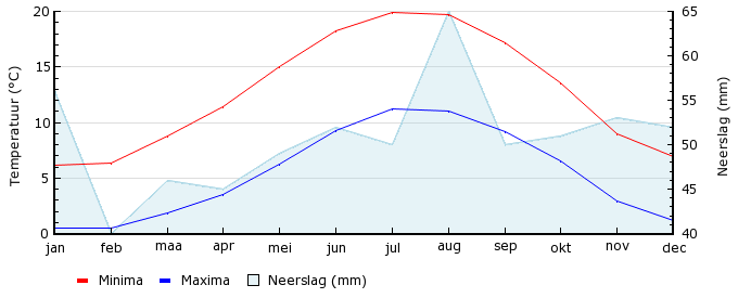 | Gem. max. temperatuur in °C | 6.1 | 6.3 | 8.8 | 11.4 | 15.0 | 18.2 | 19.9 | 19.7 | 17.2 | 13.6 | 9.0 | 6.9 |