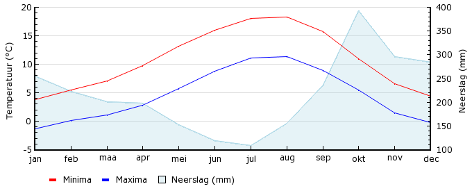 | Gem. min. temperatuur in °C | -1.3 | .1 | 1.1 | 2.8 | 5.7 | 8.8 | 11.1 | 11.3 | 8.9 | 5.5 | 1.5 | -.3 |