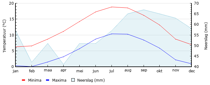 | Gem. max. temperatuur in °C | 6.2 | 6.5 | 8.7 | 11.1 | 14.2 | 17.3 | 18.8 | 18.5 | 16.2 | 13.2 | 8.7 | 6.9 |