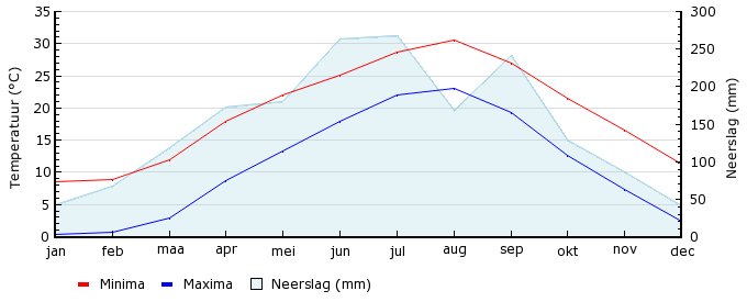 | Gem. max. temperatuur in °C | 8.6 | 8.9 | 12.0 | 17.9 | 22.1 | 25.1 | 28.6 | 30.5 | 26.9 | 21.5 | 16.5 | 11.3 |