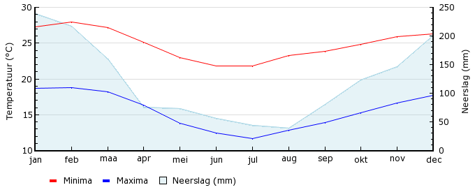 | Gem. min. temperatuur in °C | 18.7 | 18.8 | 18.2 | 16.3 | 13.8 | 12.4 | 11.7 | 12.8 | 13.9 | 15.3 | 16.6 | 17.7 |