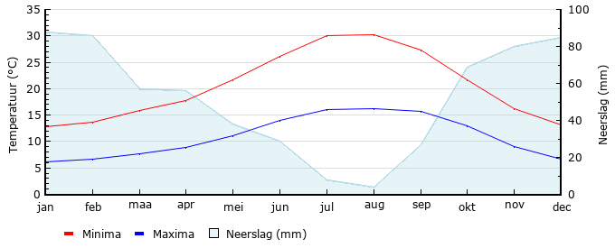 | Gem. max. temperatuur in °C | 12.8 | 13.7 | 15.9 | 17.8 | 21.6 | 26.2 | 30.0 | 30.2 | 27.4 | 21.7 | 16.3 | 13.1 |