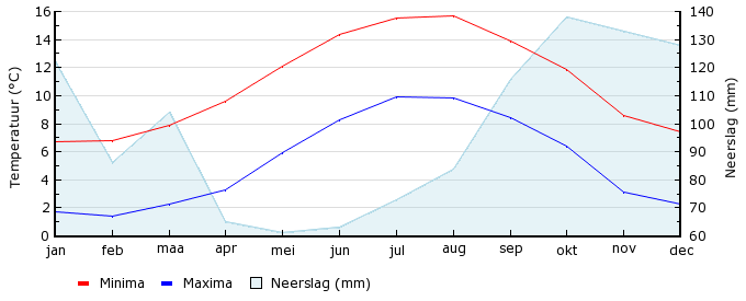 | Gem. min. temperatuur in °C | 1.7 | 1.4 | 2.3 | 3.3 | 5.9 | 8.3 | 9.9 | 9.8 | 8.4 | 6.4 | 3.1 | 2.3 |
