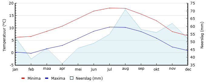 | Gem. max. temperatuur in °C | 6.2 | 6.6 | 8.6 | 10.7 | 13.8 | 16.8 | 18.1 | 17.9 | 15.6 | 12.9 | 8.5 | 6.8 |
