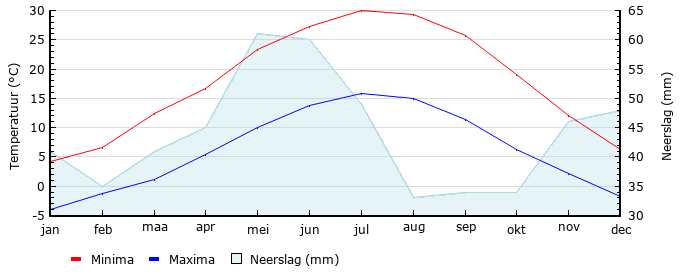 | Gem. min. temperatuur in °C | -4.0 | -1.3 | 1.2 | 5.4 | 10.1 | 13.8 | 15.8 | 14.9 | 11.4 | 6.2 | 2.1 | -1.7 |