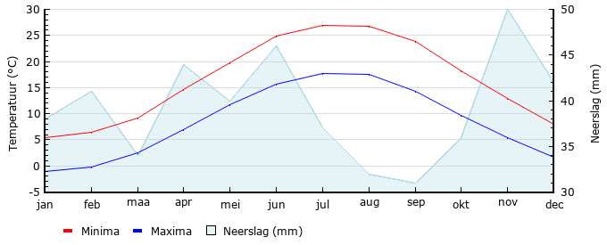 | Gem. max. temperatuur in °C | 5.5 | 6.4 | 9.1 | 14.7 | 19.7 | 24.8 | 27.0 | 26.8 | 23.8 | 18.2 | 13.0 | 7.9 |