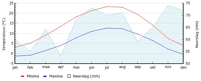 | Gem. min. temperatuur in °C | -1.4 | -.9 | 1.4 | 4.0 | 7.8 | 10.9 | 12.5 | 12.3 | 9.7 | 6.4 | 2.2 | -.4 |