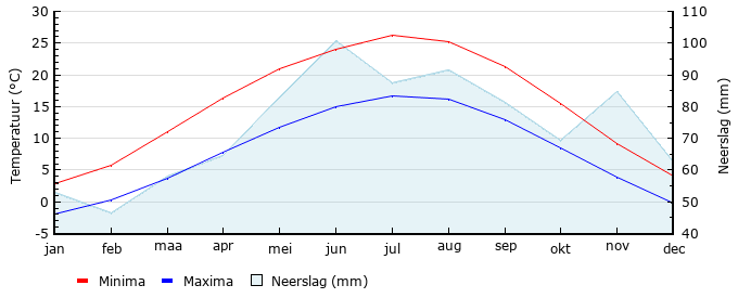 | Gem. max. temperatuur in °C | 2.8 | 5.8 | 11.1 | 16.3 | 20.9 | 24.0 | 26.2 | 25.2 | 21.3 | 15.5 | 9.2 | 4.1 |