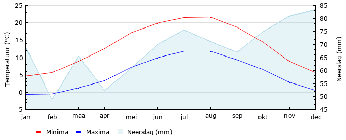 | Gem. max. temperatuur in °C | 4.6 | 5.7 | 8.9 | 12.5 | 17.1 | 19.9 | 21.5 | 21.6 | 18.7 | 14.5 | 8.9 | 5.7 |