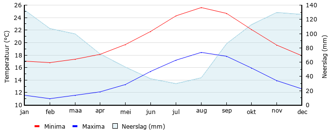 | Gem. max. temperatuur in °C | 17.0 | 16.8 | 17.3 | 18.1 | 19.7 | 21.8 | 24.3 | 25.6 | 24.7 | 22.1 | 19.6 | 17.9 |