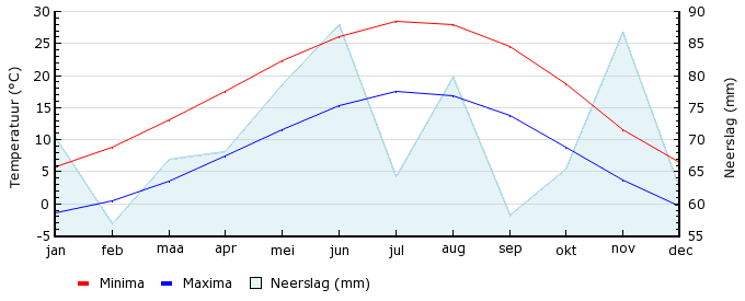 | Gem. max. temperatuur in °C | 5.7 | 8.8 | 13.1 | 17.5 | 22.4 | 26.0 | 28.4 | 27.9 | 24.5 | 18.8 | 11.5 | 6.5 |