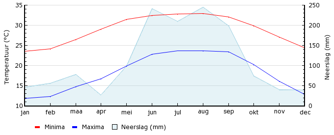 | Gem. max. temperatuur in °C | 23.5 | 24.1 | 26.5 | 29.0 | 31.5 | 32.4 | 32.8 | 32.9 | 32.1 | 29.9 | 27.1 | 24.4 |