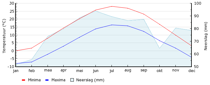 | Gem. min. temperatuur in °C | -8.0 | -7.1 | -2.1 | 2.9 | 8.5 | 13.8 | 16.3 | 15.7 | 12.3 | 6.4 | 1.7 | -4.2 |