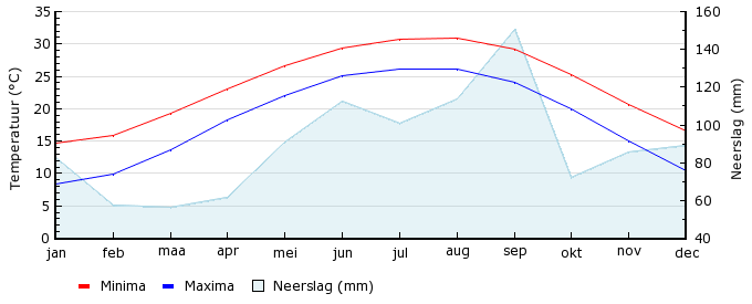| Gem. max. temperatuur in °C | 14.6 | 15.8 | 19.3 | 23.1 | 26.6 | 29.4 | 30.7 | 30.9 | 29.2 | 25.3 | 20.7 | 16.6 |