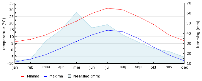 | Gem. max. temperatuur in °C | 6.2 | 8.1 | 11.2 | 16.6 | 21.6 | 27.4 | 31.2 | 29.9 | 24.9 | 19.1 | 11.4 | 6.9 |