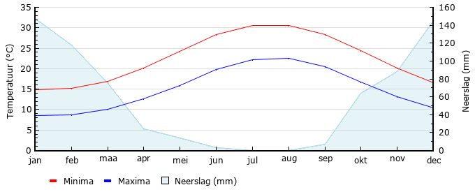 | Gem. max. temperatuur in °C | 14.9 | 15.2 | 16.9 | 20.2 | 24.3 | 28.4 | 30.5 | 30.6 | 28.3 | 24.4 | 20.1 | 16.6 |