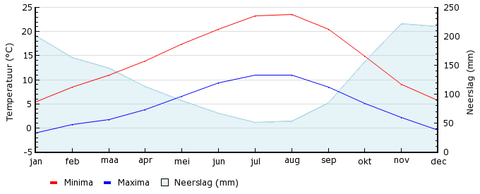 | Gem. min. temperatuur in °C | -1.0 | 0.7 | 1.7 | 3.8 | 6.5 | 9.4 | 10.9 | 10.9 | 8.5 | 5.1 | 2.2 | -0.5 |