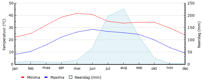 | Gem. max. temperatuur in °C | 22.3 | 25.2 | 32.0 | 38.5 | 41.6 | 40.7 | 35.2 | 33.7 | 34.4 | 34.3 | 29.7 | 24.0 |