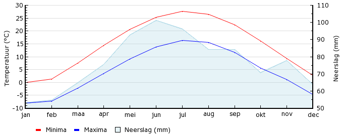 | Gem. min. temperatuur in °C | -8.1 | -7.2 | -2.1 | 3.4 | 9.1 | 13.8 | 16.4 | 15.6 | 11.6 | 5.6 | 1.1 | -4.8 |